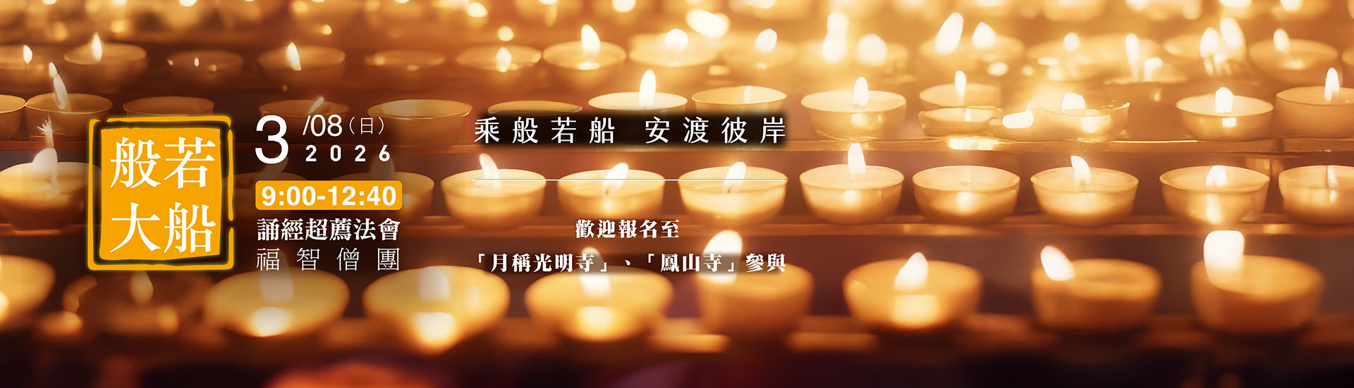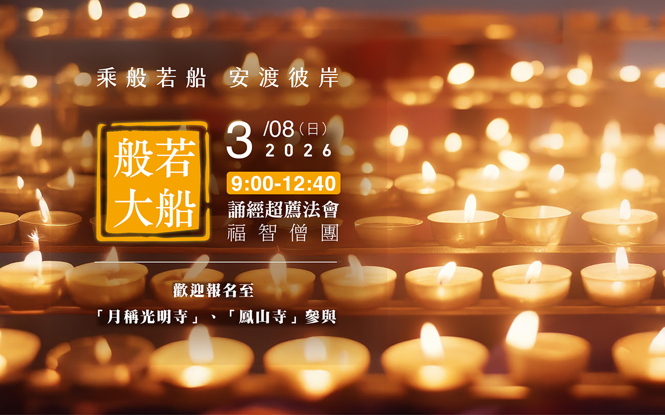 福智僧團2026/3/8(日)09:00舉辦3月超薦法會,恭誦《大般若經》第432卷。本次開放實體場地「苗栗月稱光明寺」、「新竹鳳山寺」,歡迎事前報名,跟著法師一起皈依誦經,為世界眾生祈福!