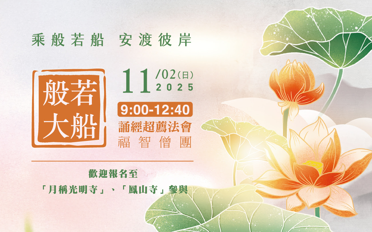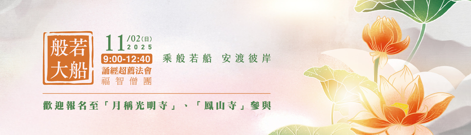 福智僧團2025/11/2(日)09:00舉辦11月超薦法會,恭誦《大般若經》第428卷。本次開放實體場地「苗栗月稱光明寺」、「新竹鳳山寺」,歡迎事前報名,跟著法師一起皈依誦經,為世界眾生祈福!