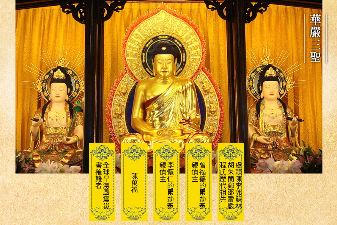 往生蓮位將依選擇的希願處,安置於華嚴三聖法座前(亦稱釋迦三尊,依左至右,分別為普賢菩薩、釋迦牟尼佛、文殊菩薩),祈願亡者得暇滿人身,學弘宗大師教法